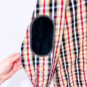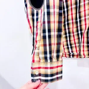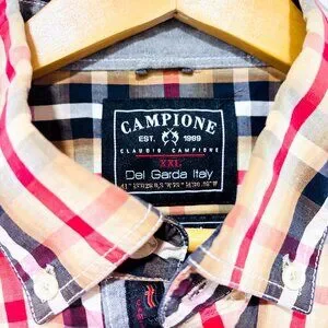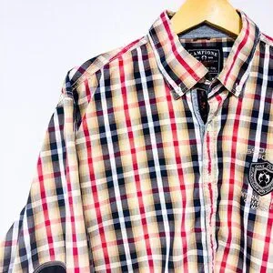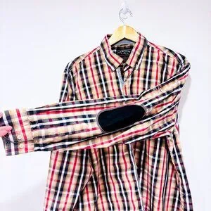 This Campione button-down shirt features a classic plaid pattern in beige, black, and red for a timeless menswear look. Crafted from 100% cotton, it feels breathable and comfortable for all-day wear. The contrast elbow patches add a refined, preppy touch that pairs well with denim or chinos. Ideal for casual days, layered fall outfits, or relaxed office styling.