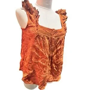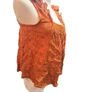 Keywords: Lucky Brand, tank top, orange, eyelet, flutter sleeve, square neck, button front, boho, summery, lightweight, casual, feminine, made in India, los angeles