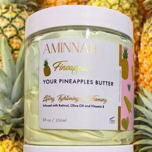 AMINNAH Fineapples paired pineapple butter and scrub. Fresh pineapple-scented body butter and exfoliating scrub. Infused with nourishing oils and vitamin E. Bright, tropical green color.