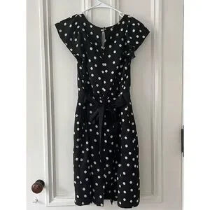 Express size 4, black and beige, polkadotted ruffle dress, zips on sides, belted, pockets polyester, fully lined, pit to pit 17 inches, shoulder to bottom approximately 35.5 inches, cap sleeves