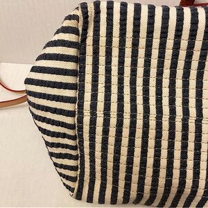 Dooney & Bourke 1975 Logo Duck Tag Blue and White Striped Preppy Seersucker Top Handle Satchel Tote Handbag. ZIP closure. Inside has pink lining and standard compartments. Handle and side traditional Dooney leather. One tiny tiny tiny tiny hand oil on leather handle as pictured and one dark dot on inside lining as pictured. Overall in excellent condition.