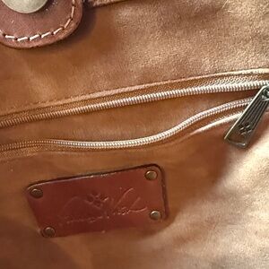 Patricia Nash tote with ornate hand-tooled floral leather. Rich chestnut color with contrast stitching. Double shoulder straps for easy carry. Classic structured silhouette with artisan detailing. Handles 11”.