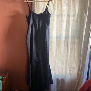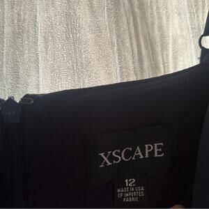 Xscape Satin Ruffle Dress Navy Blue Hi Low Maxi Formal Gown Sleeveless NWT Sz 12