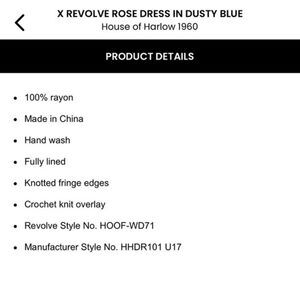 100% rayon Made in China Hand wash Fully lined Knotted fringe edges Crochet knit overlay Revolve Style No. HOOF-WD71 Manufacturer Style No. HHDR101 U17