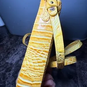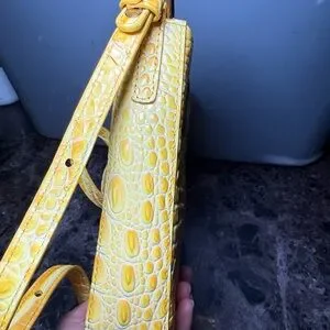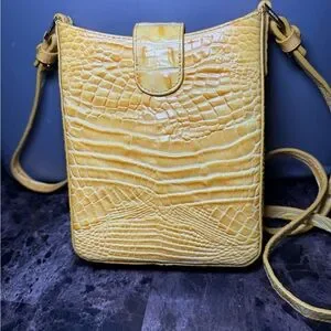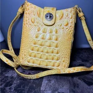 Croc-embossed leather crossbody from Brahmin. Features a secure turn-lock closure. Adjustable strap for hands-free wear. Structured silhouette with textured detailing. Bright yellow tone adds vibrant style. Has a few pen marks on interior.