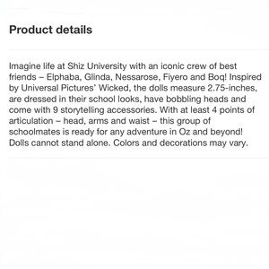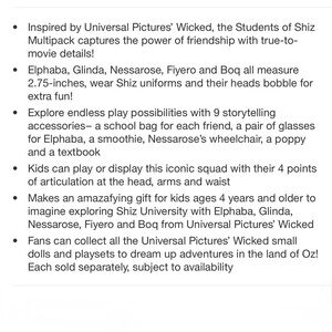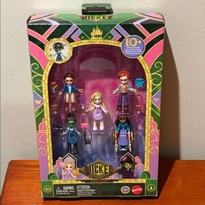 NWT Universal Pictures Wicked Students of Shiz small doll set. Made by Mattel, inspired by the movie Wicked, set includes five mini dolls: Elphaba, Glinda, Nessarose, Fiyero, Boq and multiple accessories.