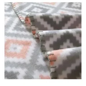 Soft fleece throw with Aztec-inspired geometric pattern. Plush texture for cozy layering. Subtle coral accents brighten neutral gray base. Easy to style with modern or casual decor.