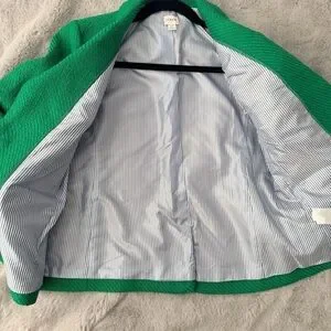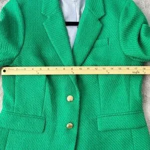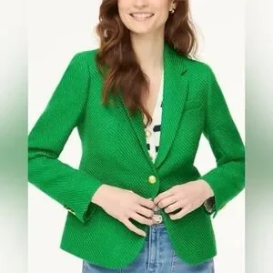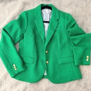 This is the ultimate "cool professor" or "preppy chic" staple. This specific version features a rich, textured green tweed—a standout, sold-out colorway that rarely hits the resale market. Add a pop of sophisticated color to your wardrobe with this highly sought-after J.Crew Factory Schoolboy Blazer. With its tailored fit and iconic gold crest buttons, it’s a timeless piece that retails for $218.