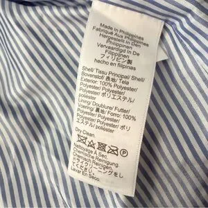 • Lining: blue/white vertical stripe lining (looks great with cuffed sleeves!).