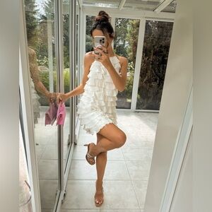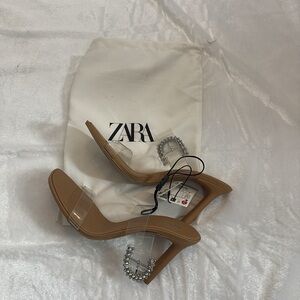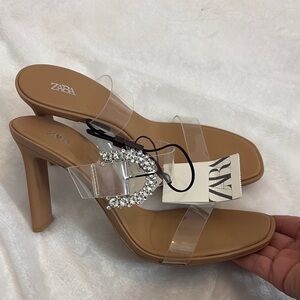 Elegant Zara heels with clear straps. Tan base with rhinestone embellishment. Perfect for any occasion.