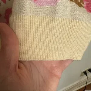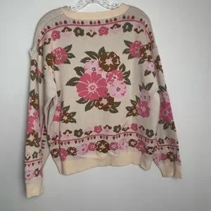 Chic floral cardigan with pink and brown tones. Perfect for layering. Little spot on the back waist. Photo to reflect. Hav not tried to clean.