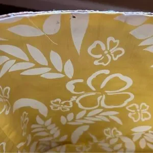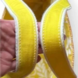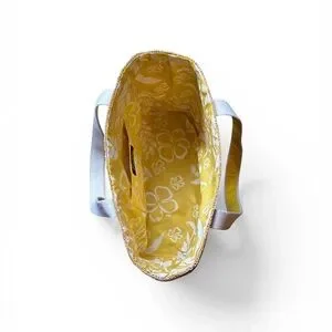 Natural straw tote with bright yellow trim and cream fabric handles. Lightweight and roomy for daily use. Yellow accents add a fresh, stylish touch. Canvas handles provide comfortable carrying. Good condition. One small imperfection please see picture for reference.