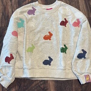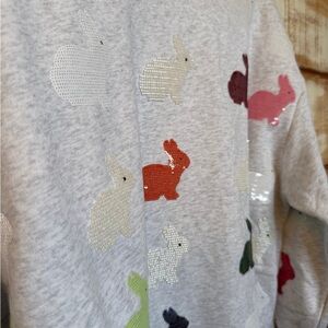 Soft gray crewneck sweatshirt. Scattered sequin bunny appliqués in multiple bright colors. Fun playful look with sparkle details. Easy to style for casual wear.