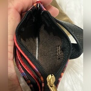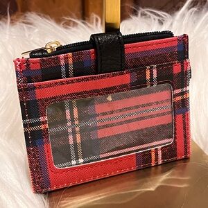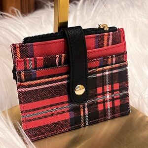 Compact red plaid card holder with black snap strap. Features multiple card slots and a zippered coin pocket. Stylish red and black design for everyday use.