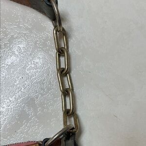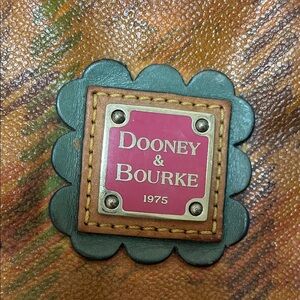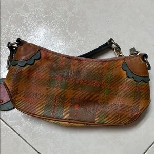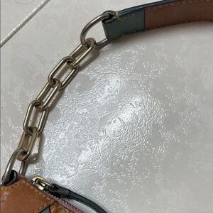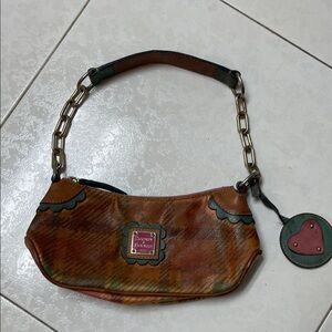 Dooney & Bourke mini shoulder bag in a warm brown leather with multicolor wash. Features green scalloped trim and a heart charm. Chain-link strap with leather shoulder pad. Decorative logo plaque at center. The outside fine, inside lining needs to be replaced —it’s very wearable if you don’t care about the inside or just want to change it -