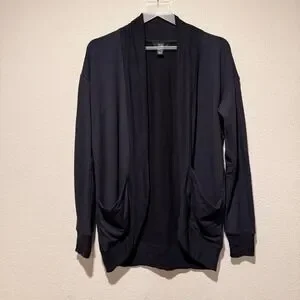 Athleta Girl black open front cardigan wrap with a draped silhouette and functional thumbhole cuffs. This versatile layering piece features deep front pockets and a ribbed shawl collar that extends down the front. The soft, stretchy fabric and relaxed fit make it an ideal choice for pre- or post-workout wear, travel, or casual everyday lounging. A subtle reflective logo on the sleeve adds a signature touch to this classic athletic-inspired staple.