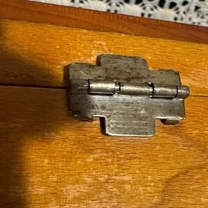 The varnish is coming off of the brown wood finish in places and cracked in others. The scenic inlay has some chipping on the left side and the rest shows signs that it might be wearing thin. There are surface scratches. The handle is not level on one end but is sturdy. There is a crack in the back outside of the lid approximately 8 1/2 inches long. The inside is dull unfinished wood. The henge in the lid is there but not attached to the side. The outside henges have rusting but function appropriately. There is mirror patina, a classic sign of aging and didn’t look any different after cleaning.