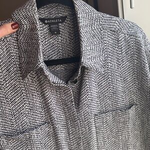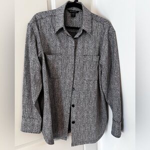 Relaxed button-down shirt in a gray herringbone weave. Point collar and full button front. Long sleeves with roll-tab styling. Soft textured fabric for everyday wear.