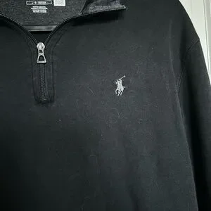 Polo by Ralph Lauren quarter-zip pullover in black. Soft fabric with a contrast inner collar. Embroidered pony logo at the chest. Clean, minimalist style for everyday wear.