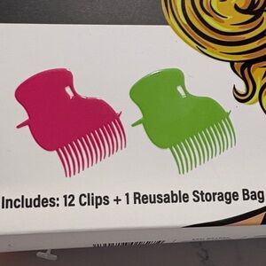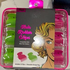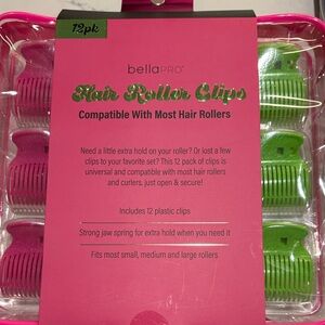 Set of pink and green hair roller clips for secure hold while styling. Durable plastic design helps keep rollers in place. Includes multiple clips in vibrant pink and green for versatile styling. Compact set ideal for everyday hair styling needs.