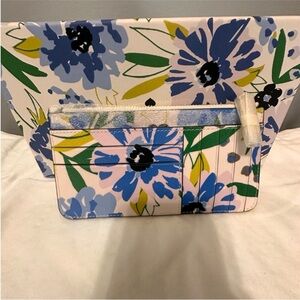 kate spade zip pouch with bold blue floral print. Green leaves and yellow highlights accent the design. Gold-tone logo hardware on front. Slim, versatile pouch for cards and small essentials.