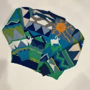Colorful Hand-Knit Mountain & Sheep Cardigan - Blue/Green Palette