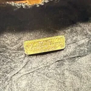 Gold hardshell exterior, black felt lining, gold chain, decorative beaded crystal button clasp