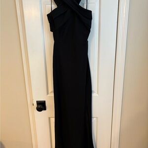 Chic black maxi with a crossed halter neckline. Figure-skimming fit highlights the silhouette. High side slit adds dramatic movement. Elegant and modern for evening wear.