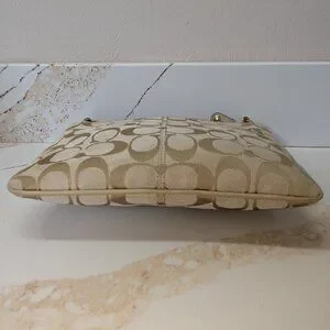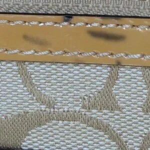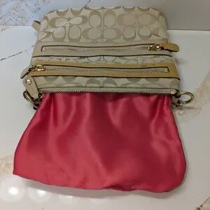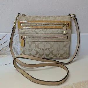 Coach crossbody, front zip pockets, jacquard & leather.