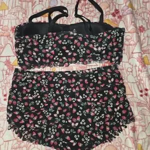 Two-piece bikini with a black background and small pink floral print. High-waist bottoms and supportive bandeau-style top with adjustable straps. Feminine, retro-inspired look. Great for summer pool days.