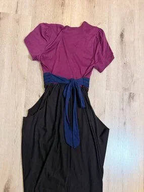 The ultimate Y2K "it-girl" dress! This iconic Ruby Rox colorblock piece features a deep magenta wrap bodice, a navy blue ruched empire waist, and a flowy black skirt. Known as the "travel dress" for its super stretchy, wrinkle-resistant matte jersey fabric. Perfect for a Whimsigoth or 2000s-inspired look!
