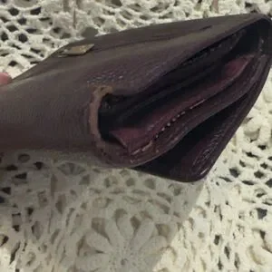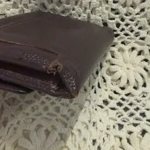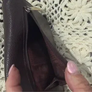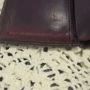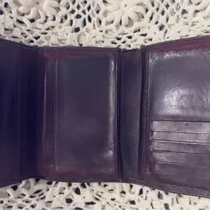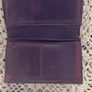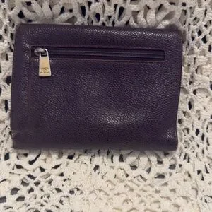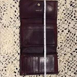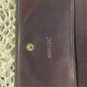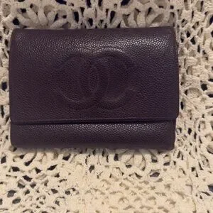 Classic Chanel wallet in textured caviar leather. Deep plum hue with embossed interlocking CC on flap. Sleek bifold silhouette with refined styling. Perfect for organized everyday use.