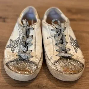 Golden Goose Superstar Glitter Sneakers – Silver/Gold Star | Size 10 | Girls