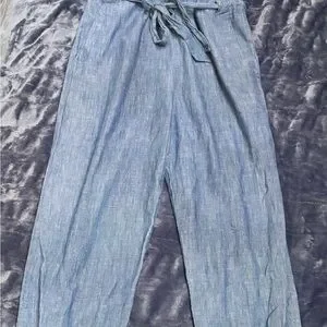 Sleeveless denim jumpsuit with a scooped neckline. Tie waist for a flattering fit. Back keyhole detail. Soft, lightweight chambray fabric. Versatile casual style.