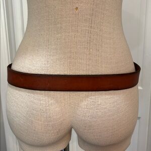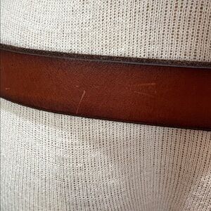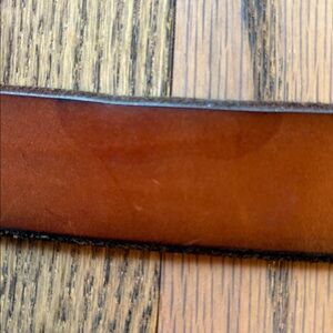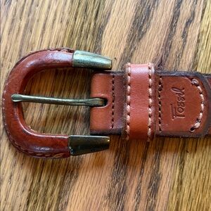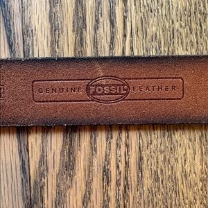 Fossil size medium brown leather belt with brass and leather buckle. Belt has some scuffing and brass is tarnished. Great broke in look. Belt is still in very good condition. Fossil is branded in multiple spots. Belt measures 41 inches tip to tip including buckle and is 1 1/4 inches wide.