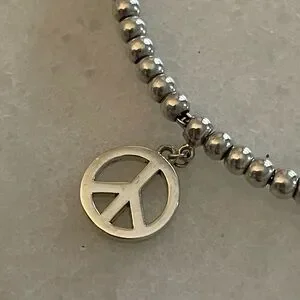 Elegant silver bracelet featuring a peace charm. Perfect for adding a touch of sophistication to any outfit.