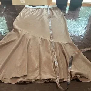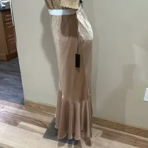 This tan maxi skirt features a sophisticated trumpet silhouette, perfect for work or cocktail occasions. The asymmetrical ruffled hem adds a touch of elegance and movement, making it a standout piece in any wardrobe.