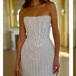 Elegant strapless evening dress in ivory with cascading pearl beadwork. Figure-flattering silhouette and refined detailing for special occasions. Lightweight lining and secure fit at the bust for comfortable wear. Perfect for formal events and receptions.