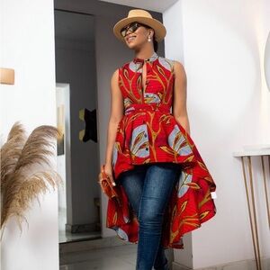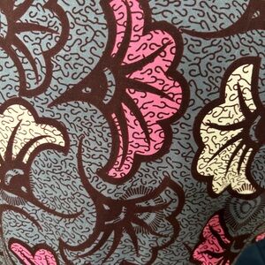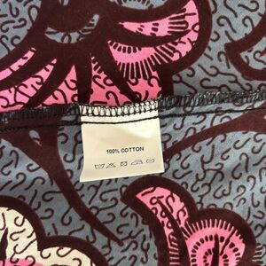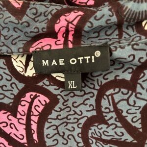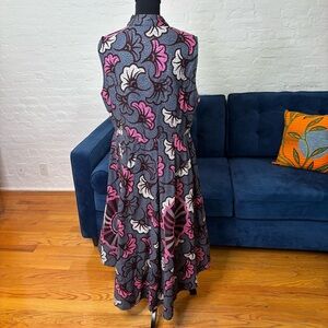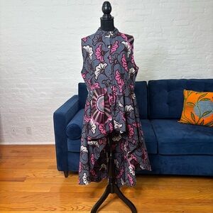 Dramatic high-low blouse with fabulous pleated fall in the back. Colorful pattern in grey, pink, mauve and maroon. Button down and high neck. Perfect over a pair of white jeans and heels.
