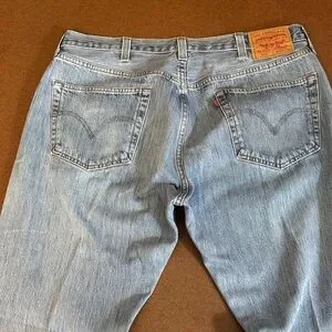 Classic straight-leg silhouette by Levi's. Medium blue denim with tasteful wash. Clean lines and subtle texture. Easy to style for casual looks.