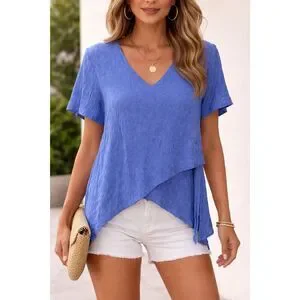 Stylish and flattering, this KSL blouse features a textured fabric design with a modern asymmetrical hemline. The V-neckline and short sleeves create a comfortable and elegant look, making it perfect for work, casual outings, or dressy everyday wear.