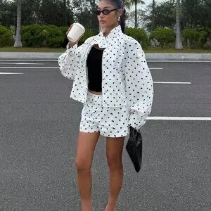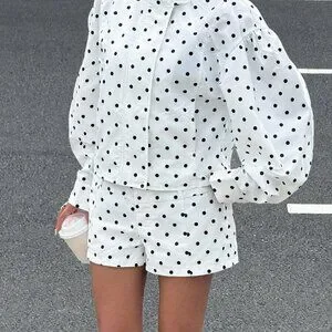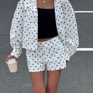 Casual Women's Polka Dot Print Long Sleeve Zip Front Jacket And Shorts set