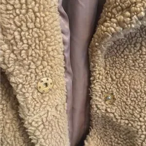Plush teddy coat with a relaxed, easy fit. Button-front closure and roomy side pockets. Soft, fuzzy texture for cozy layering. Timeless camel color that pairs with denim and neutrals.