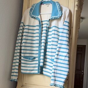 Lightweight knit cardigan blazer with cream base and light blue stripes. Button-front closure and two front pockets. Ruffle-trimmed collar for feminine detail. Soft fabric ideal for layering.