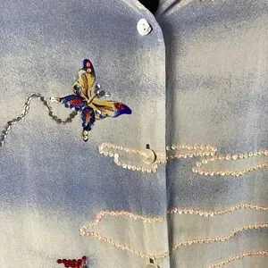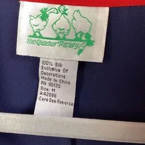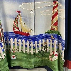Quaker factory Vintage Silk Blue Red embroidered Sequin lighthouse sailboat button-up Size Medium button front