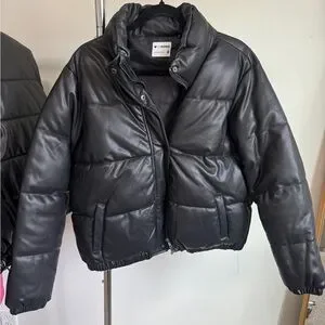 Stylish black puffer jacket in faux leather. Snap and zipper front closure. Side pockets and quilted paneling. Classic cropped silhouette.