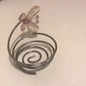 Silver-tone spiral wire holder with a decorative pink and clear beaded flower accent. Lightweight metal construction. Decorative tabletop accent piece.