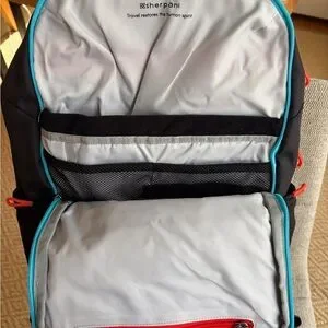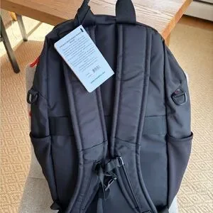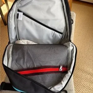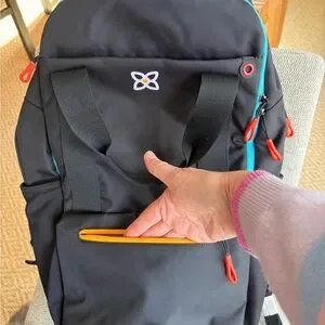 Terrific everyday commuter bag or travel bag. TONS of pockets to keep you organized: water bottle, sunglasses, padded laptop area. Bright yellow and turquoise zippers , and red zipper pulls make it playful. Can be carried as a backpack, a tote, or a crossbody. Durable and high quality materials throughout.