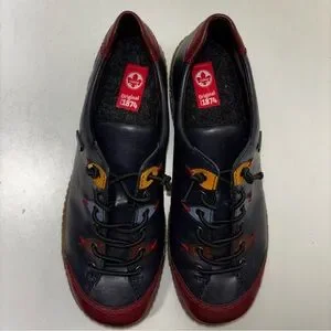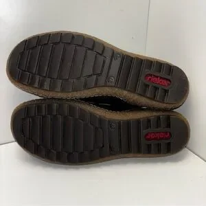 Rieker Liv 61 (L7561) sneakers in navy blue, red, and brown color block. Featuring synthetic uppers, this women's shoe comes with elastic lace closures and RiekerTex waterproof lining for every condition. Ladies US size 7, European size 37.