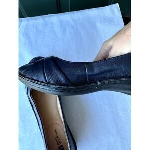 Beautiful navy blue leather ballet flats by white mountain are effortlessly stylish and always right on trend. Featuring a beautiful pleated and folded design on full grain leather, the navy upper sits atop a comfy black rubber 3/4" heel. Perfect for feet that need just a little support (and that isn't found in true "flats") and all day comfort.